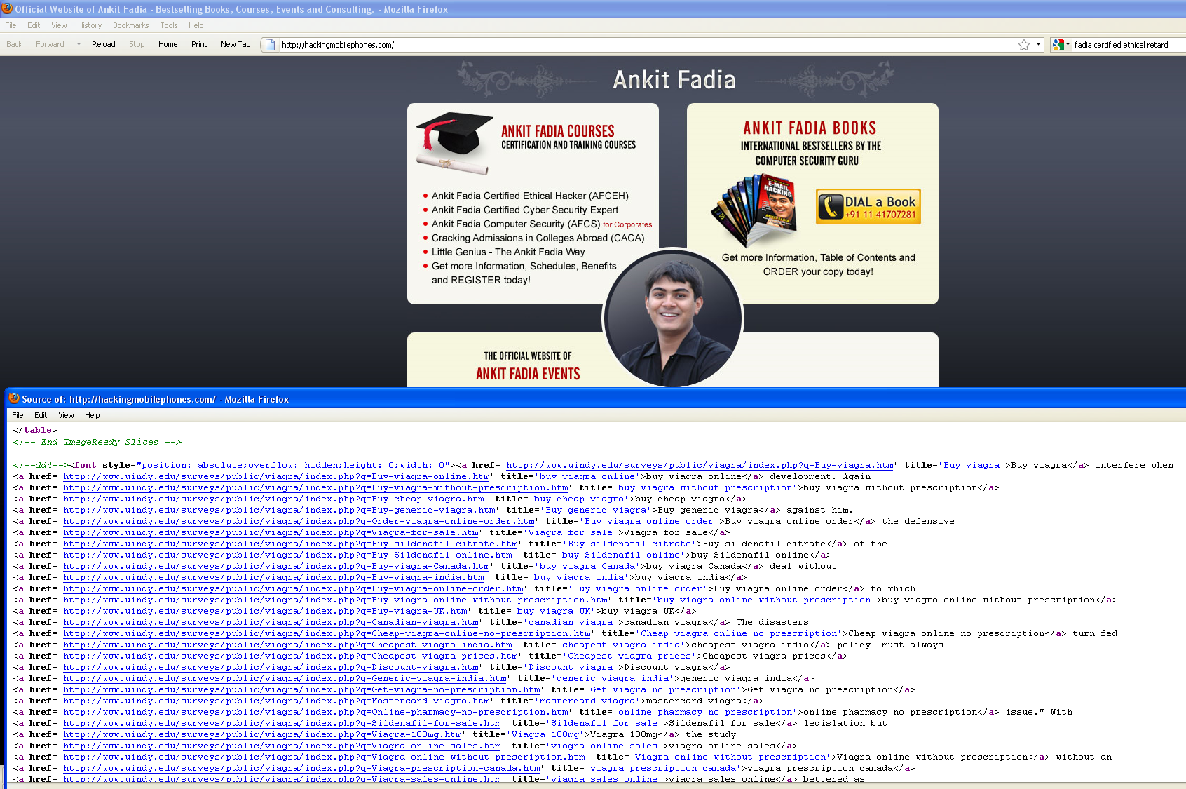 Ankit Fadia, India's uber hacking expert, appears to heavily promote Viagra, or been hacked by evil spammers that found a way to subtlety deface the web page. Archive.org shows us that the Viagra spam was put there sometime on or before July 11, 2008. Interestingly, Fadia never noticed these changes at any point, or he did and opted not to inform his provider who he subsequently blamed and denied he was responsible.