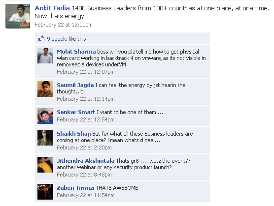 - "in February, I will be in Barcelona as the youngest speaker on computer security from 150 countries" - The only conference this seemingly could be is "Mobile World Congress. According to the agenda, Fadia did not speak there. His Facebook updates say he was in Barcelona on Feb 21 "for work", says the event involves 1400 business leaders from 100+ countries, took the stage Feb 23 and flew out on Feb 25 to Hungary. When asked what event it was, he does not answer.Extensive searches find no big conference that matches this date / location.