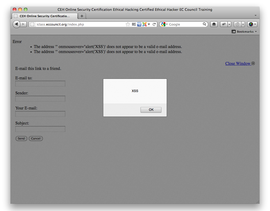 After recent actions of EC-Council became more public, we received a tip that the EC-Council.org web site is vulnerable to an additional XSS vulnerability. The iclass.eccouncil.org site appears to use the Joomla! CMS or a system similar to it. The 'com_mailto' component has several parameters vulnerable to XSS via POST requests. using FireFox 8 and the following injection string, our source demonstrated the vulnerability: