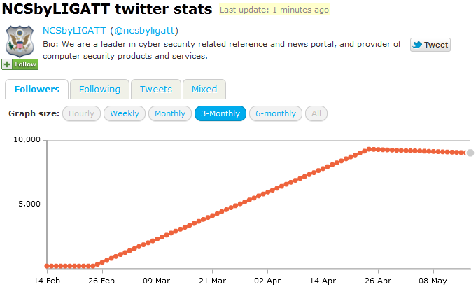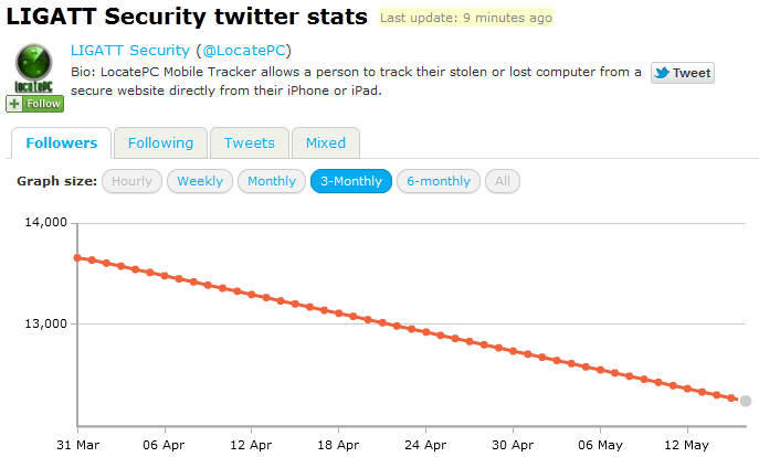 We see that the @LocatePC account has almost 14,000 followers, but is on a steady decline over three months despite the account being active and the service offering not change. This is easily explained by the fact that Twitter will suspend and delete accounts suspected of being used in this type of activity. Over that time period, Twitter likely killed off hundreds or even a thousand of these accounts, causing the drop in followers.