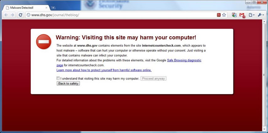 Note the URL in the screen shot. This blog page appears to be an old blog that the Department no longer uses. The home page links to http://blog.dhs.gov/, which doesn't exhibit any malicious behavior.