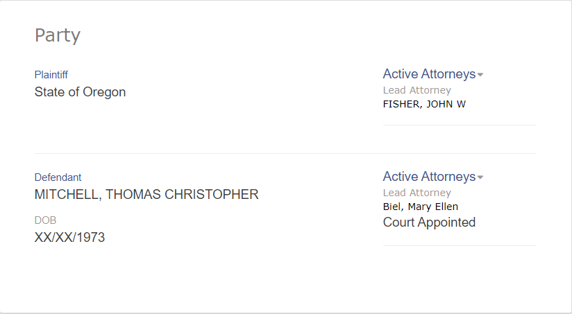 The case information is currently available on the Oregon Judicial Department online records search. Mitchell was originally charged with three counts of ORS 163.405, Sodomy in the 1st Degree, and pleaded Not Guilty to each. He subsequently changed his plea to no contest to two charges of ORS 161.405(2)(b), Attempt to Commit a Class A felony, and was sentenced for each. Sentencing included blood draw for DNA and HIV testing as well as registration as a sex offender. Relevant details of Case 05P3107 are below: