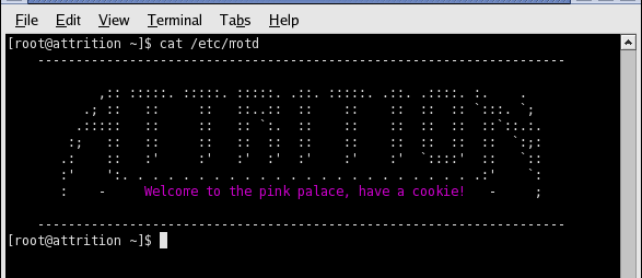 The black was simply uninviting, and the red text said “We are bad people!!” No more. Welcome to the new attrition – d2d’s attrition. Here we’re comfortable, welcoming, and jovial. No more intimidating colors that make you think every hit is being read, dig –x’d, whois’d, and noted by nepen (even though it still is). The message of the day now reads : “Welcome to the pink palace, have a cookie”. I also took the liberty of changing the root password, thereby preventing the ‘cats’ (Lyger/Jericho) from doing anything about the new look.