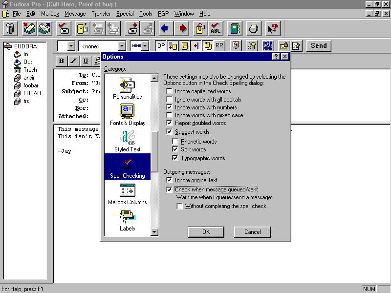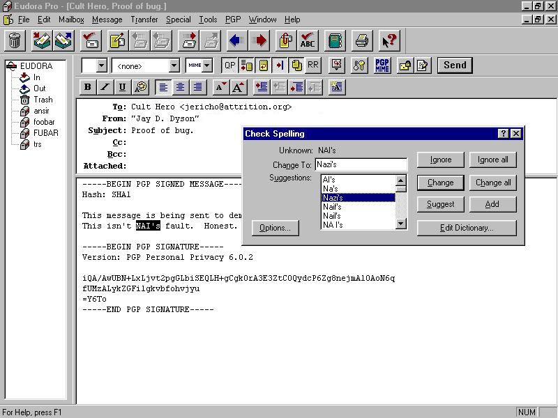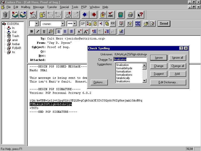 Eudora invokes PGP and signs message, then initiates spellcheck. One word is