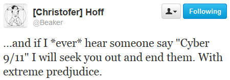 "Does a Cyber-9/11 Loom?" asks journalist Jason Bloomberg of CIO Magazine. [source] | |